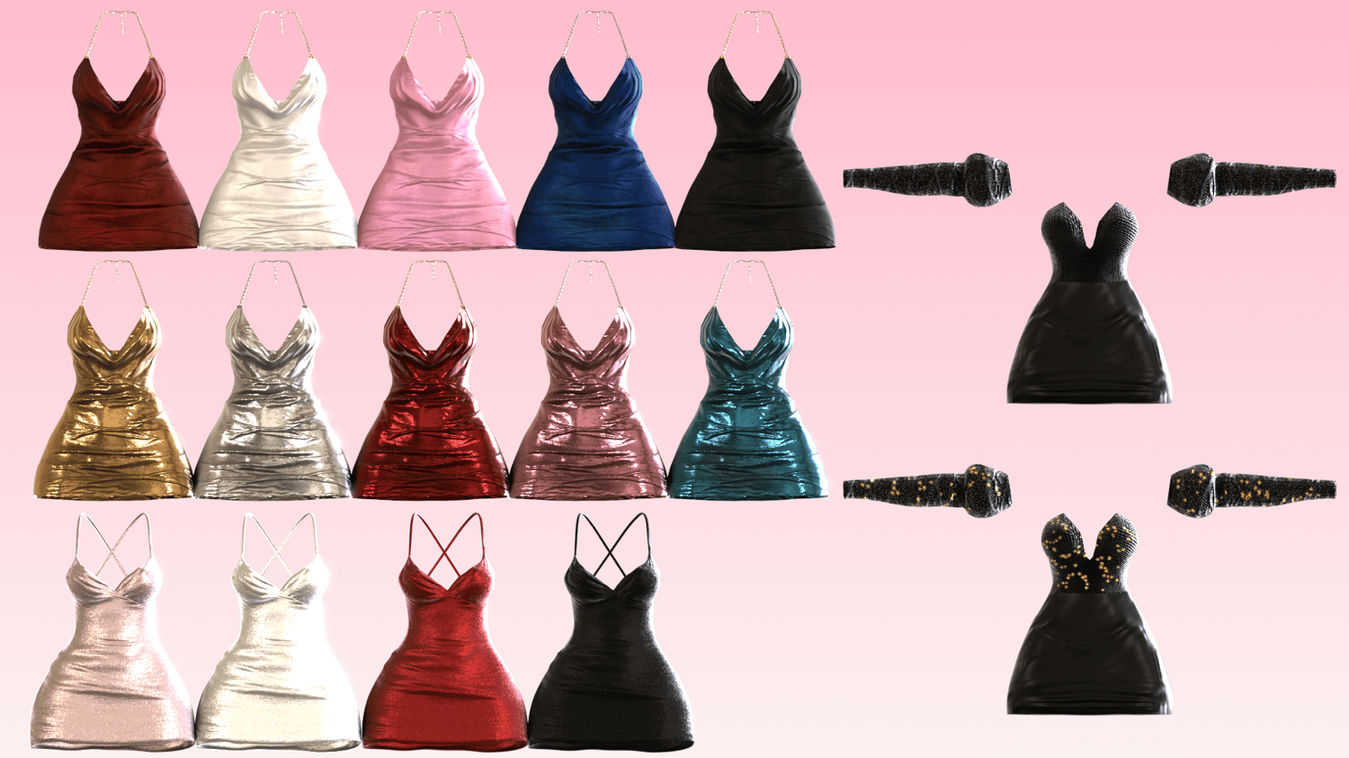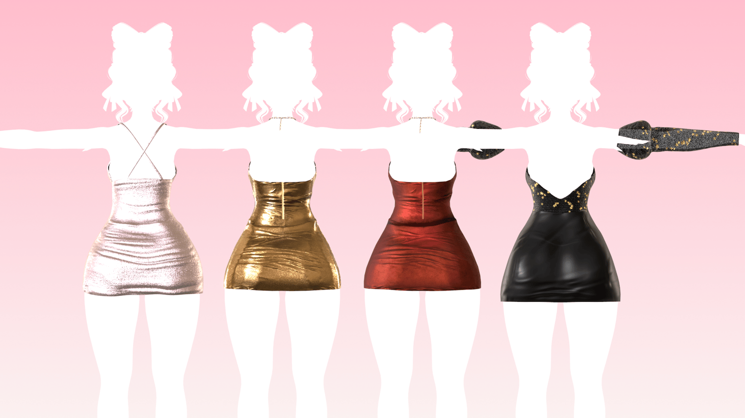3 Different party dresses! made in Marvelous Designer/Blender/Substance Painter by me! Rigged and modeled to Zinfit / VRBASE Egirl / Kiyo / Eliza Shortstack Base! (not included)