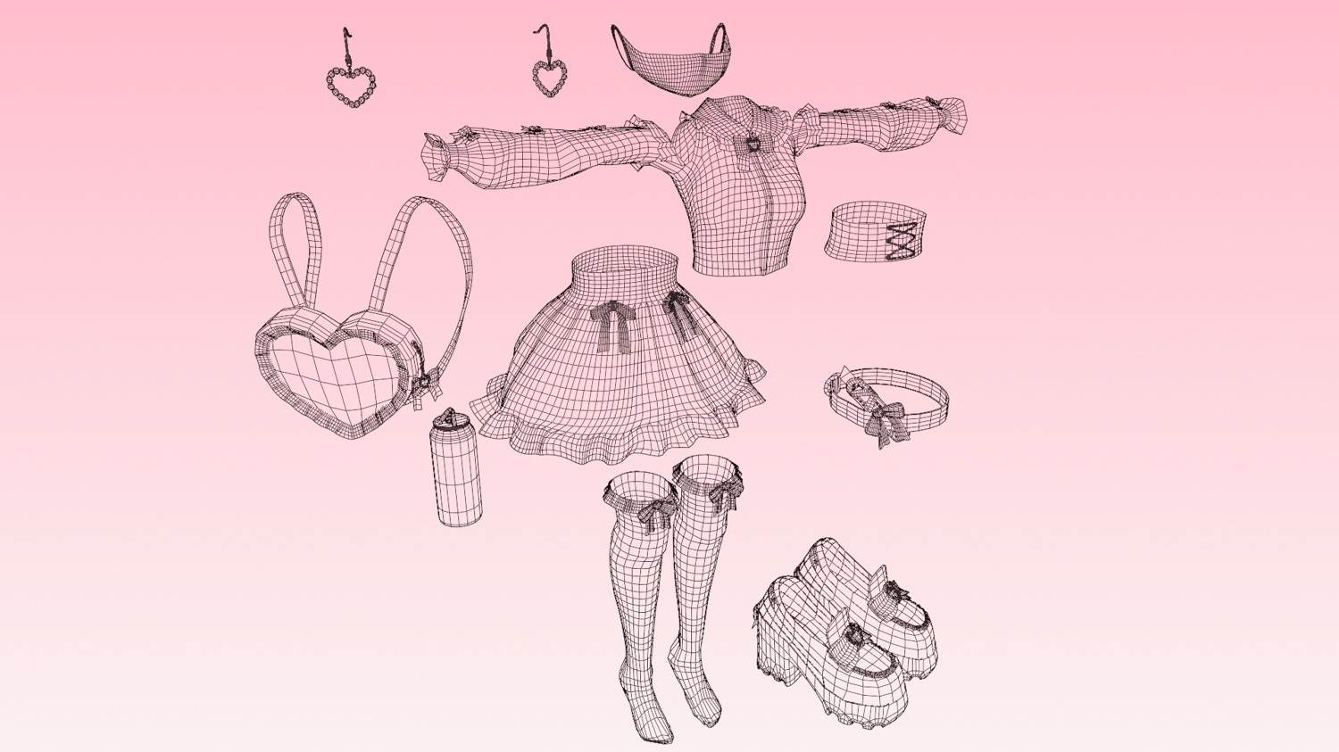 Jirai set (Mask, EarRings, Blouse, Backpack, Corset, Skirt, Garter, Socks, Loafer Shoes, Lemon Drink) made in Marvelous Designer, Substance Painter and Blender by me! Modeled and weight painted to Kiyo Base. Slight disclaimer! The socks and garter are an older asset I've rerigged and modeled for the Kiyo base, if you've previously purchased the socks, or want just the socks, and want my edit you can find them in the download page here!
