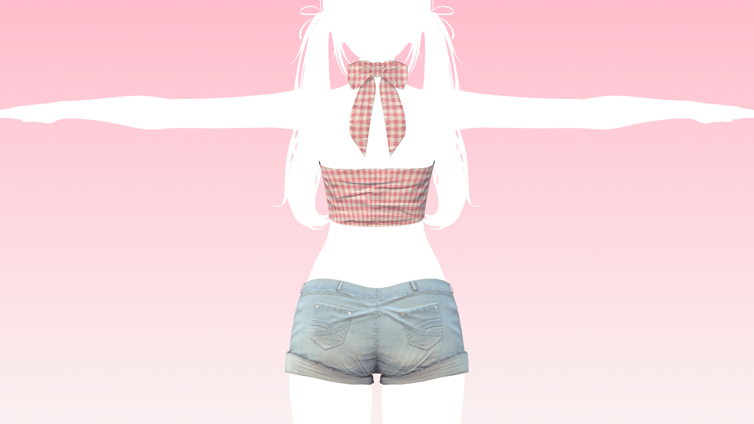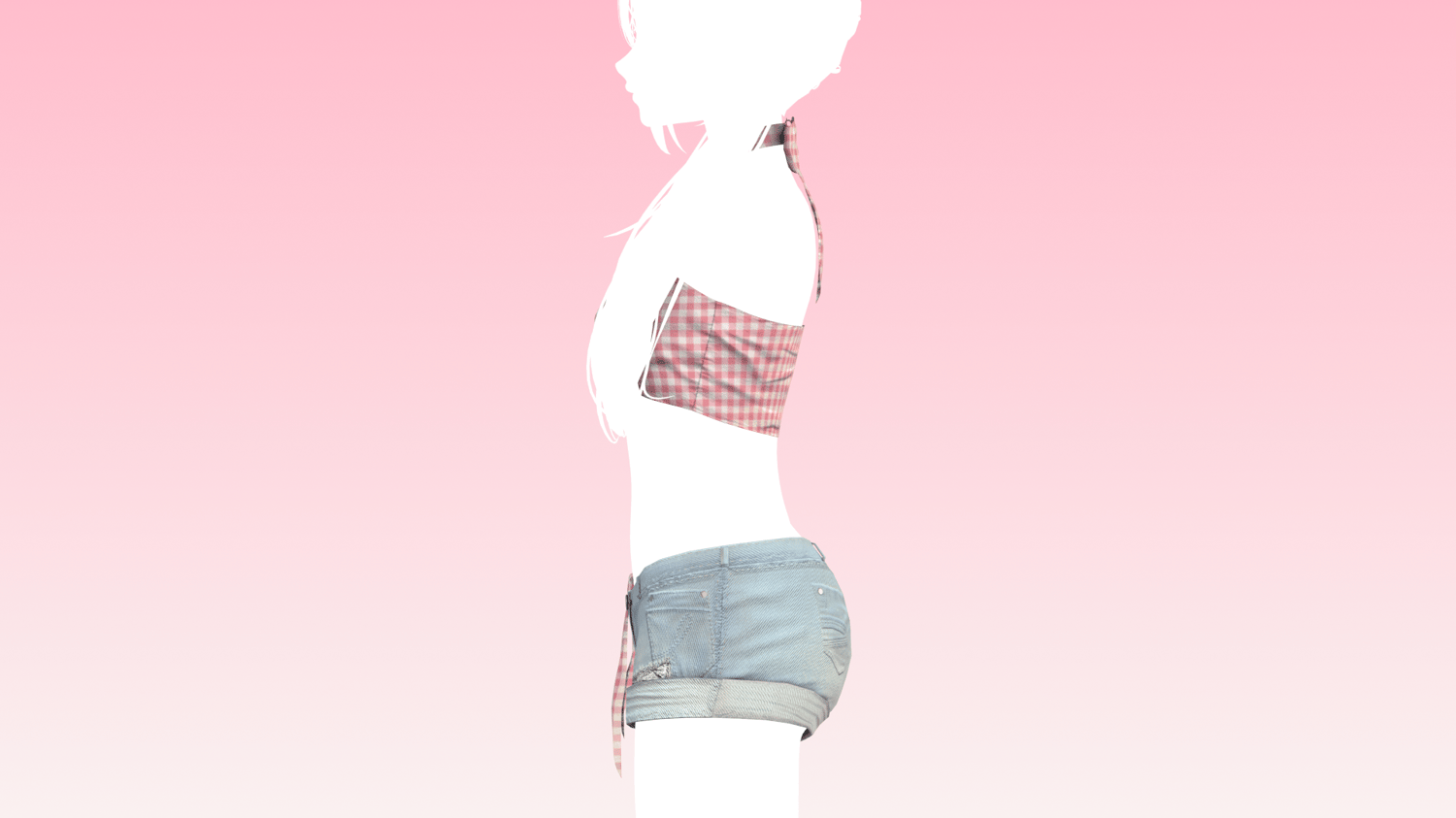 Halter bow top and denim shorts made in Marvelous Designer/Blender/Substance Painter by me! Fully rigged and modeled to Zinpia's VRBase Anime (Not included) Top bow and shorts tie are rigged for physbones!