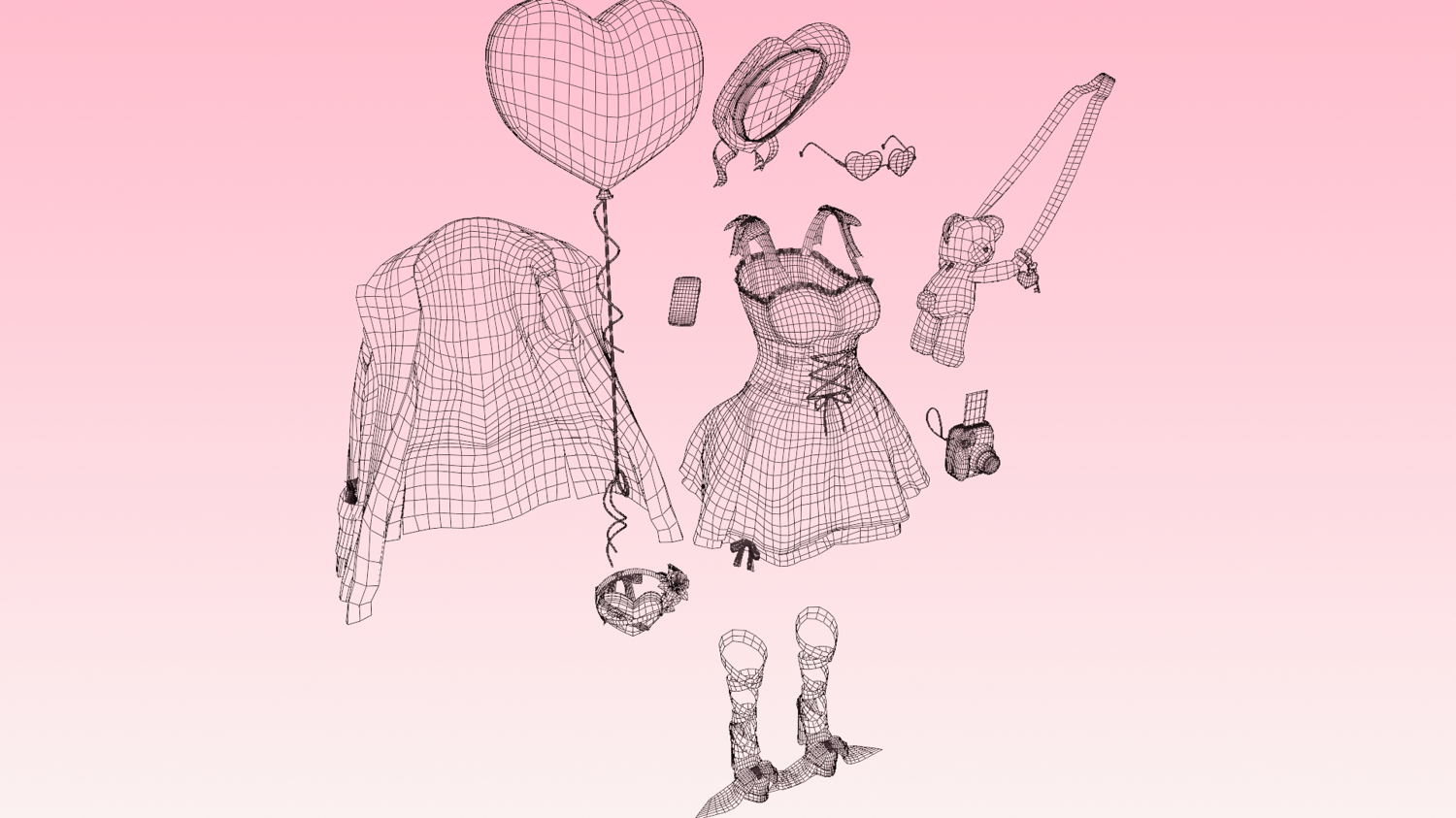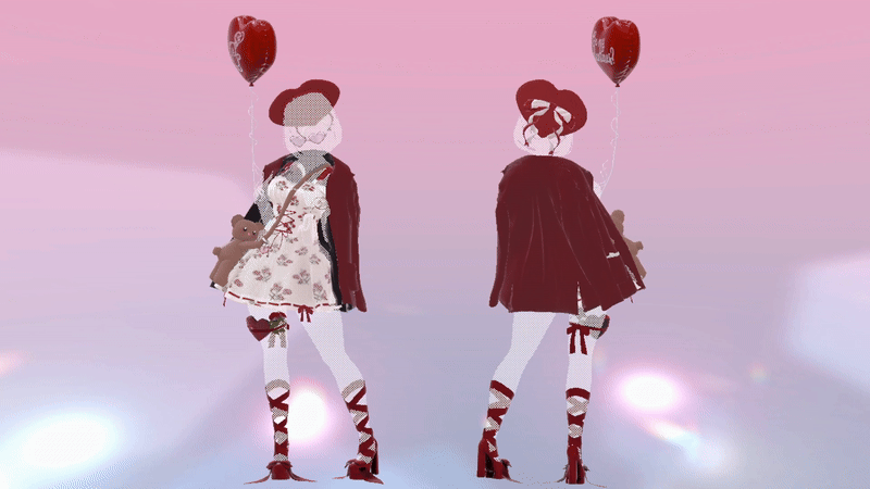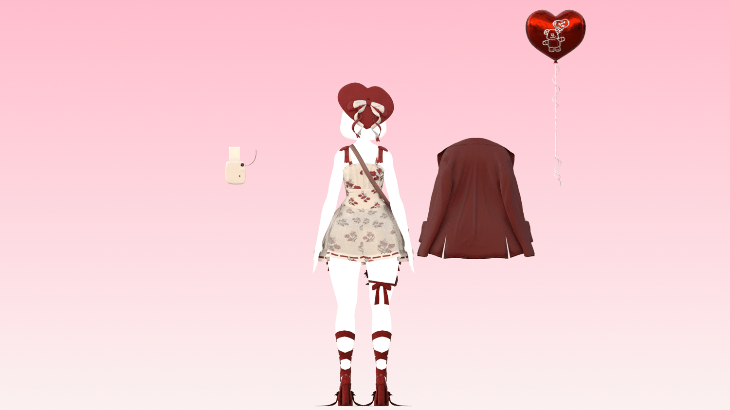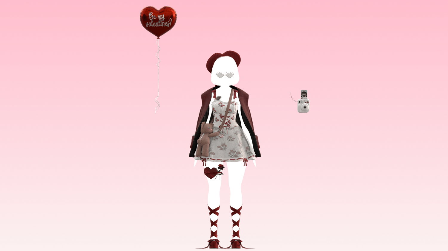 A romantic date night look (Hat Glasses Dress, Phone, Blazer, Balloon, Polaroid Camera, Chocolates and Rose Garter, Heart Strap Heels), made in Marvelous Designer/Blender/Substance Painter by me! Modeled and weight painted to Amelia AnimeHead and Zinfit (not included).